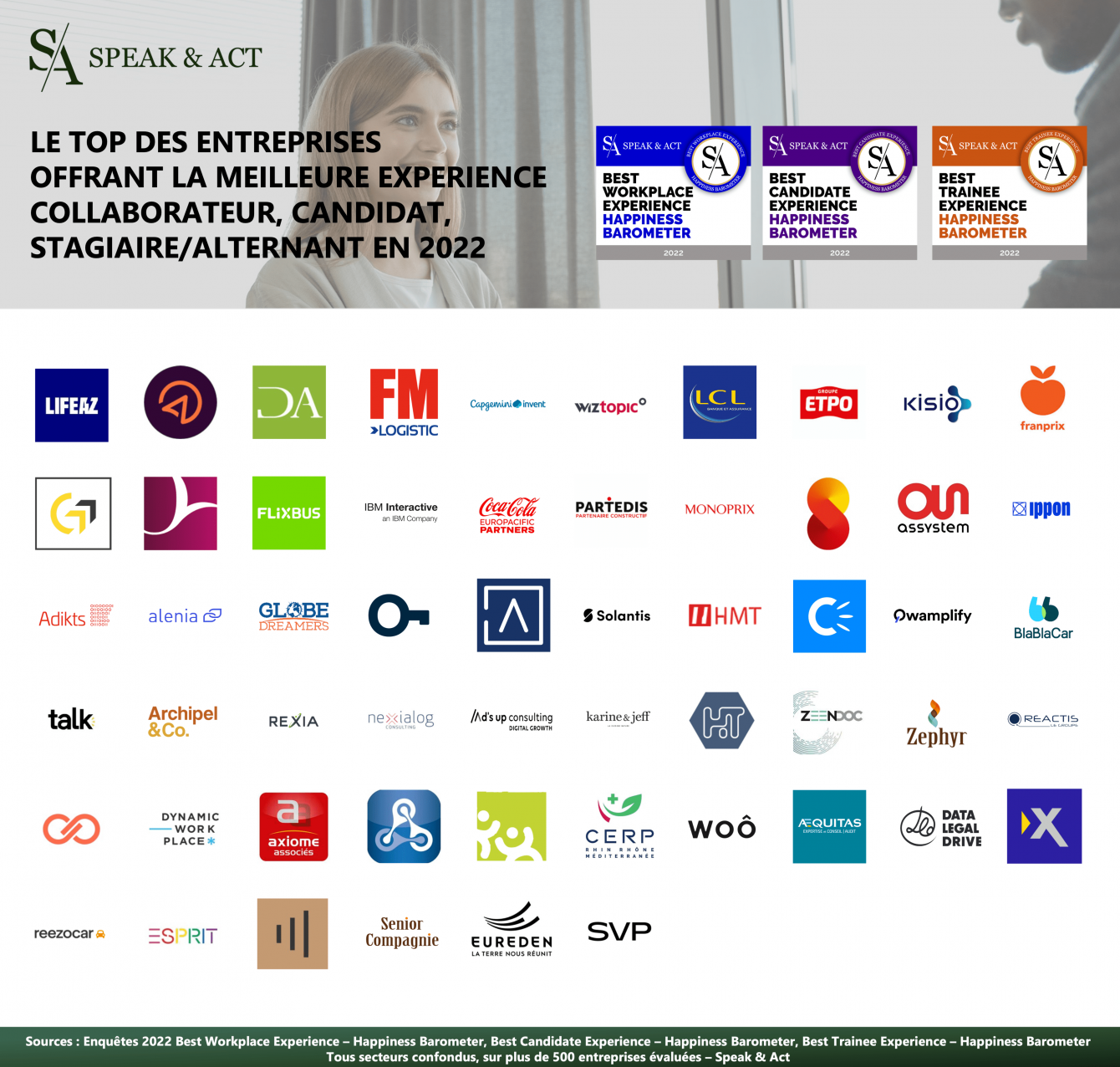 LIFEAZ – DialOnce – Denjean & Associés – FM Logistic – Capgemini Invent – Wiztopic – LCL – Groupe ETPO – KISIO – Franprix – GCC – OPTEAMIS – FlixBus – IBM Interactive – Coca-Cola Europacific Partners – Partedis – Monoprix – Ugitech – ASSYSTEM – Ippon Technologies – ADIKTS – Alenia Consulting – GlobeDreamers – Welmo – L'Atelier – Solantis – HMT – Critizr – QWAMPLIFY – BlaBlaCar – Talk – Archipel&Co – Rexia – Nexialog Consulting – Ad’s up – Karine & Jeff – HARINGTON – SAGES Informatique – Groupe Zephyr – REACTIS – Crayon France – Dynamic Workplace – Axiome Associés – MAÉ Technologies – Valoxy – CERP Rhin Rhône Méditerranée – WOÔ – Aequitas – Data Legal Drive – CAVAS – Reezocar – Esprit – Milleis Banque Privée – Senior Compagnie – Eureden – SVP