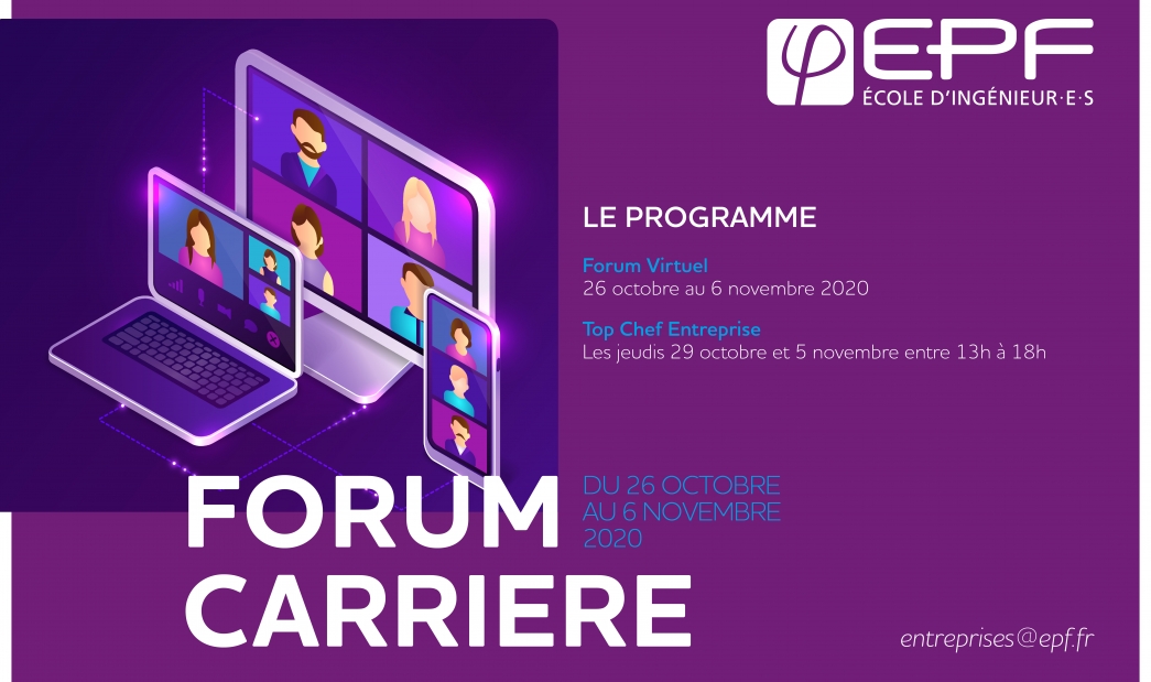 Le Forum Carrières est un événement de recrutement à destination des étudiants de 3e et 5e années mais aussi de nos jeunes diplômés des trois campus de l’EPF, entièrement virtuel, organisé du 26 octobre au 6 novembre 2020. Fort de son succès, l’événement a été prolongé jusqu’au 12 novembre pour permettre aux entreprises et aux candidats de finaliser les recrutements.