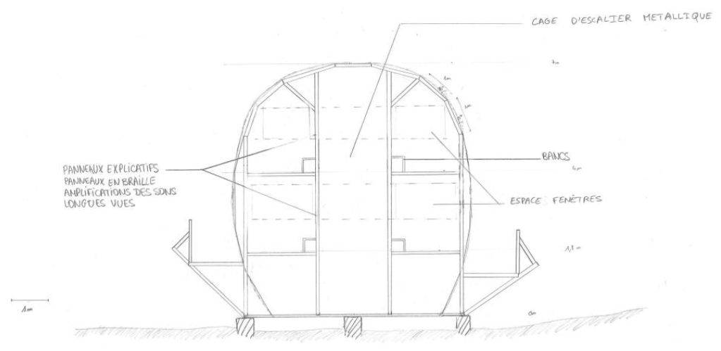 Leur projet, "L'Œufservatoire", intègre la durabilité en réutilisant les matériaux du site actuel. "La forme de notre observatoire, un nid d'oiseau avec un œuf, représentait parfaitement la fonction du site, et grâce à sa structure en bois, il ne perturbera pas la faune et la flore environnantes," expliquent-elles.