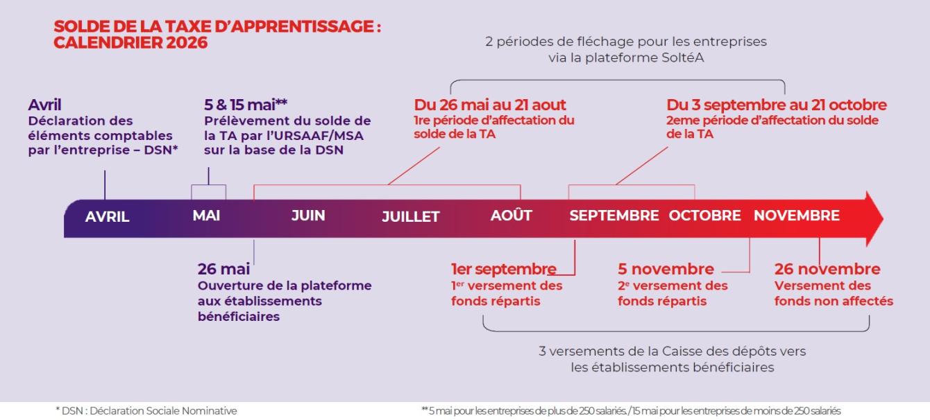 - 26 mai au 21 aout et du 3 septembre au 21 octobre 2026 :Deux périodes d’ouverture de la plateforme SoltéA aux entreprises pour préciser l’affectation du solde de la taxe d’apprentissage (fléchage) vers les établissements bénéficiaires de leur choix.
