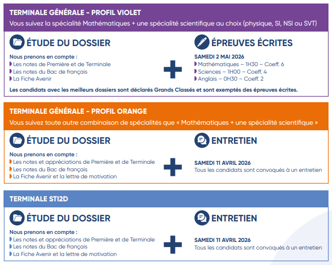 La sélection se fait sur étude du dossier scolaire : les notes de première et des deux premiers trimestres de terminale générale permettent de sélectionner les candidats.  Les « admissibles » sont convoqués à un entretien de motivation mi-avril.